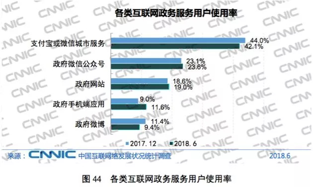 截至2018年6月,我国在线政务服务用户规模达到4.70亿,占总体网民的58.6%,有42.1%的网民通过支付宝或微信城市服务平台获得政务服务。首先,政府积极出台政策推动政务线上化发展,打通信息壁垒,构建全流程一体化在线服务平台,建设人民满意的服务型政府;其次,各级政府网站集约化程度明显提升,全国政府网站总数为19868个,较2015年第一次普查时缩减70.1%;最后,各级党政机关和群团组织等积极运用微博、微信、客户端等“两微一端”新媒体,发布政务信息、回应社会关切、推动协同治理,不断提升地方政府信息公开化、服务线上化水平。