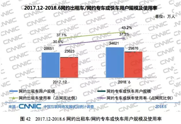 我国共享单车用户规模达到2.45亿,占网民总体的30.6%,用户规模半年增加 2432 万;我国网约出租车用户规模达到3.46亿,较2017年末增加5970万, 增长率为 20.8%;网约专车或快车用户规模达到 2.99 亿,半年增长率为26.5%,用户使用比例由30.6%提升至 37.3%。