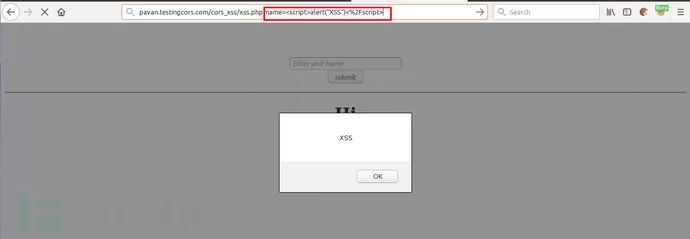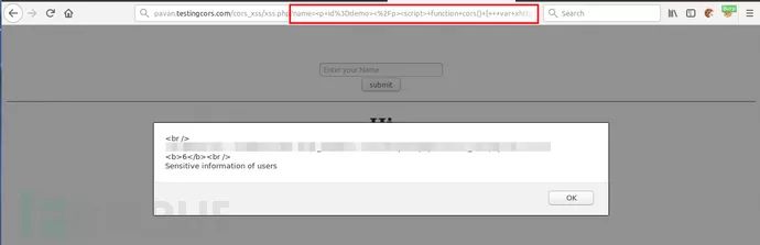 使用这个易受攻击的XSS子域,我们可以从testingcors.com上获取敏感信息。我们在“Name”参数中注入了恶意javascript payload。页面加载后,脚本将被执行,并从testingcors.com中获取敏感信息。