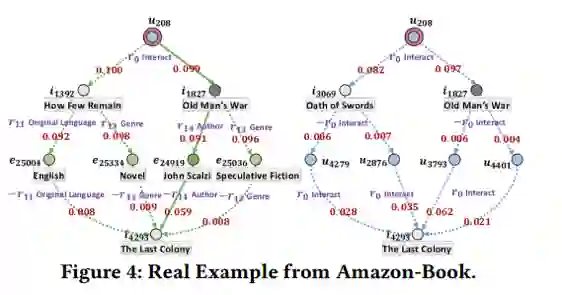 根据左图的 attention 值,可以发现给用户 u208 推荐商品 i4293 是由于用户 u208 曾经购买过商品 i1827,且商品 i1827 和商品 i4293 有共同的作者,这很明显为模型提供了一定程度的可解释性。