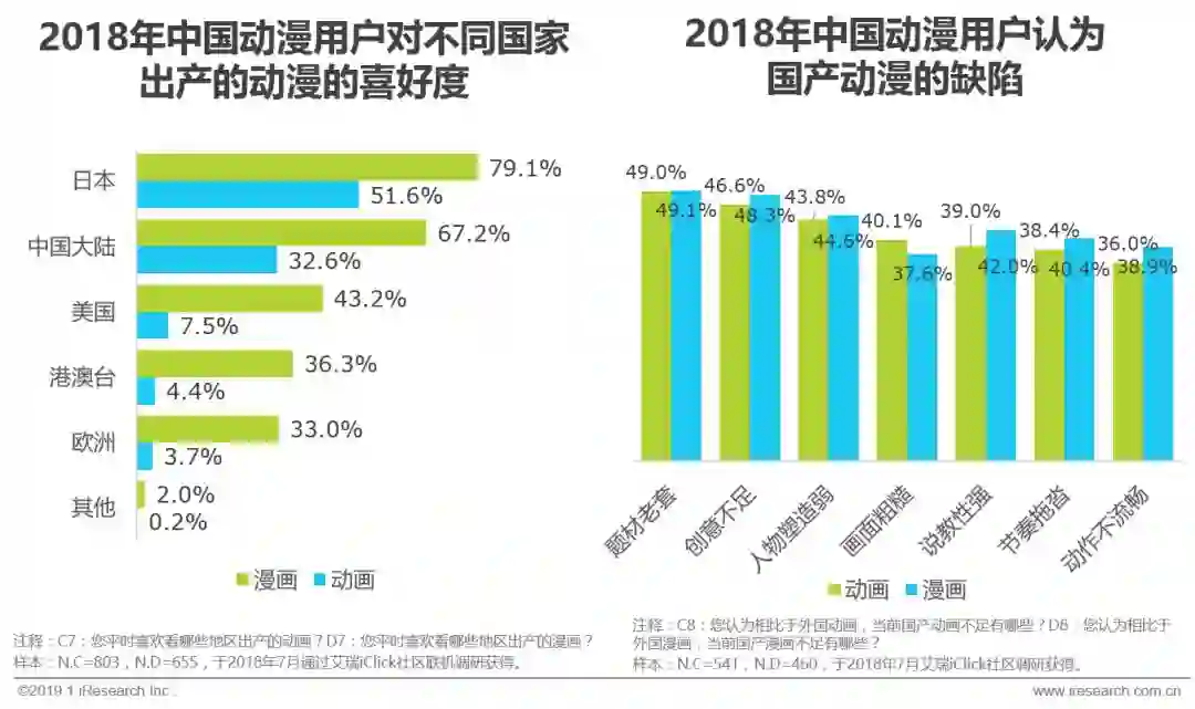 在调查中,日本动漫最受中国动漫用户的喜爱,无论是动画还是漫画,在中国的动漫用户中都有超过50%的粉丝拥簇。而中国的动漫文化产品,在拥有共同文化背景加持的情况下,喜爱度仍然次于日本动漫。在关于国产动漫与外国动漫相比较的不足方面,用户认为国产动漫创新性不够,体现在内容题材比较老套、主旨创意不足等。此外,国产动漫的人物形象塑造也不够丰满,没能出现鸣人、哆啦A梦、米老鼠、唐老鸭等全球认知度广泛的动漫形象。在漫画方面,国产漫画说教性太强、节奏拖沓的不足也被用户认为比较严重。