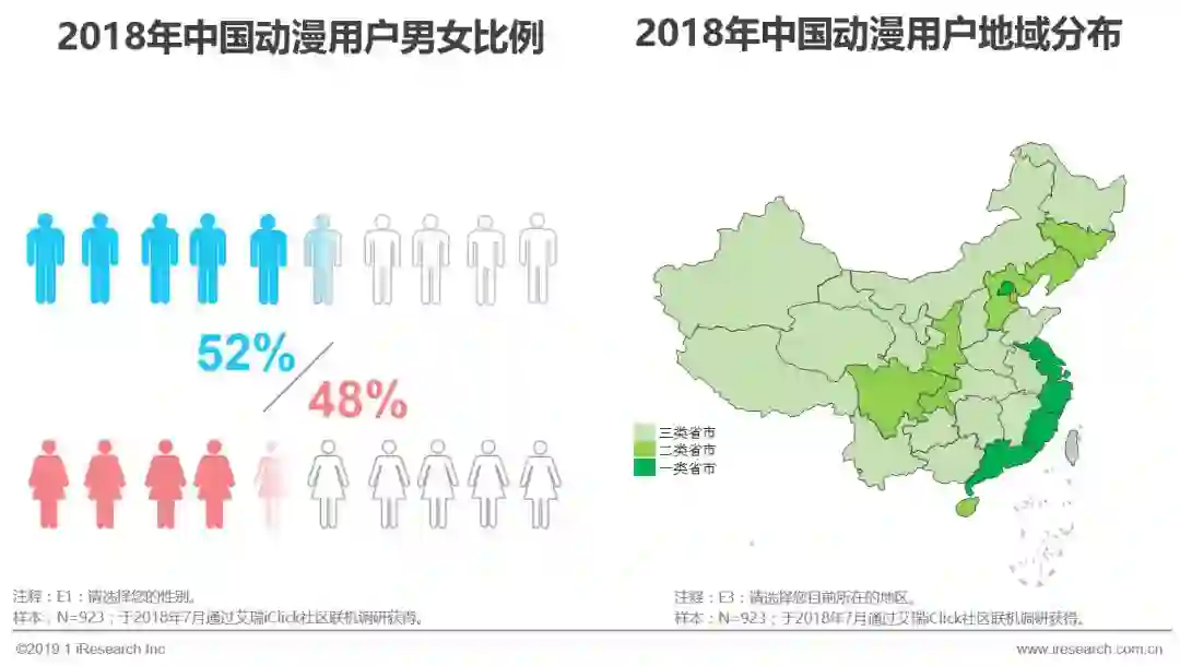 动漫用户中,男女比例约为52:48,男女基本持平。从年龄分布来看,动漫用户群体普遍年纪较轻,这些年轻用户伴随着中国互联网的发展而成长起来,有更多渠道和能力接触各种外界事物和文化,思想开放、个性鲜明、文化自觉性高。而且,从地域分布来看,经济发展较好的省市,动漫用户所占的比例也相应越高,说明了经济发展较好地区的常住居民有更多的机会和能力接触和消费动漫等娱乐文化产业,而这些人也有更高的经济能力去消费这些娱乐文化。