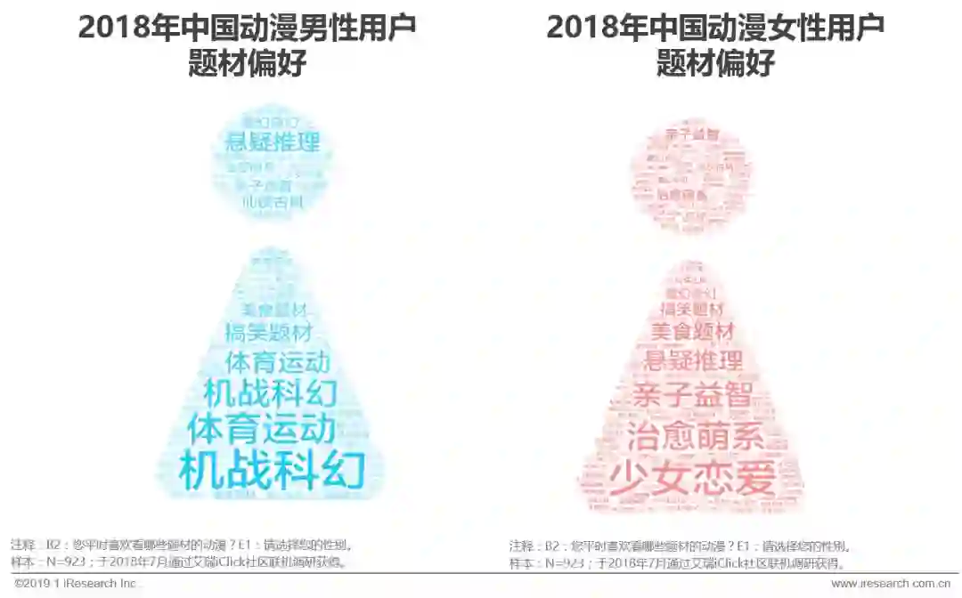 男性偏好机战和体育题材,女性偏好恋爱和萌系题材