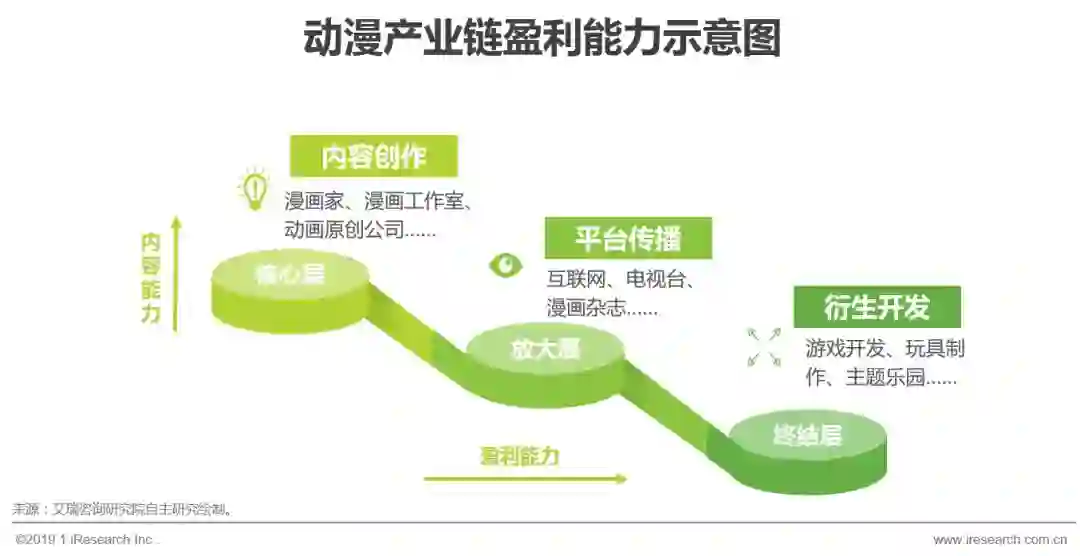 在这个文化消费降维时代,动漫产业作为IP富矿,具有巨大的IP衍生开发价值。对于动漫产业链上游企业而言,掌控明星IP,相当于对下游产业变现环节的垄断。但是 ,从盈利能力来看,IP 终结层最高,IP 放大层次之,而IP 核心层最弱,IP 产业链的盈利能力按产业链的方向逐步放大。因此,打造完整产业链必将是动漫企业未来最大的盈利方向。但是,是选择内部衍生一体化经营,还是利用各自比较优势联合发展,取决于企业在产业链中所处的位置以及自身的规模体量。