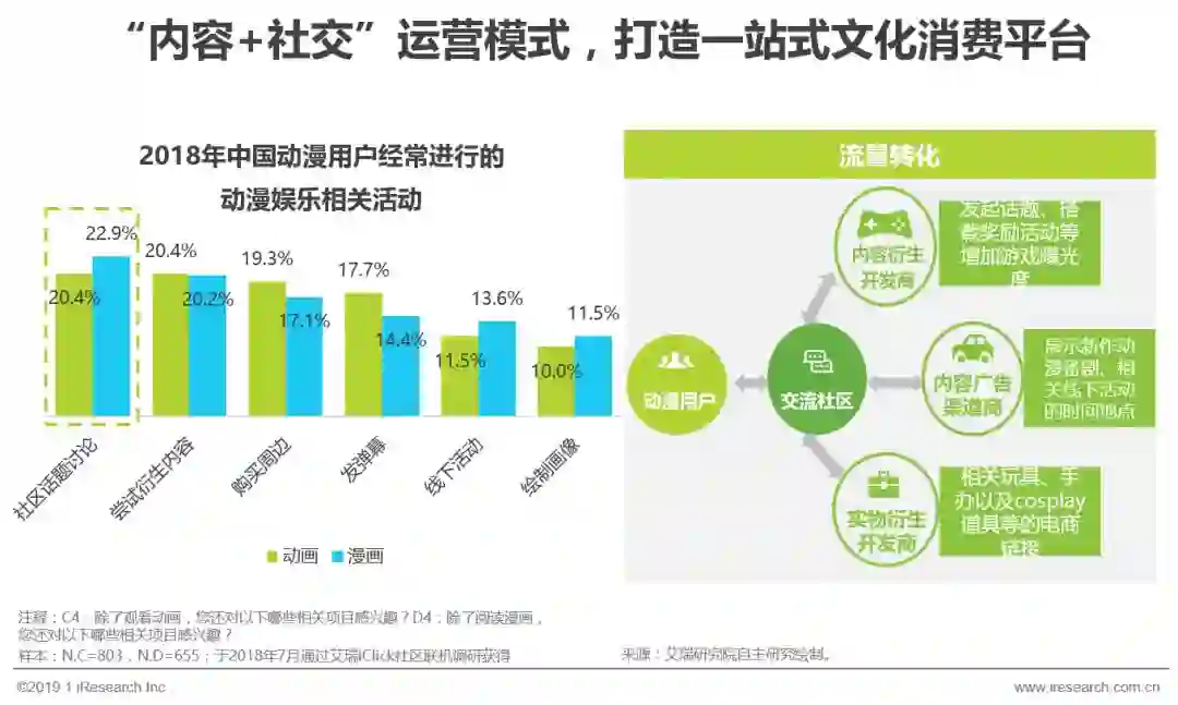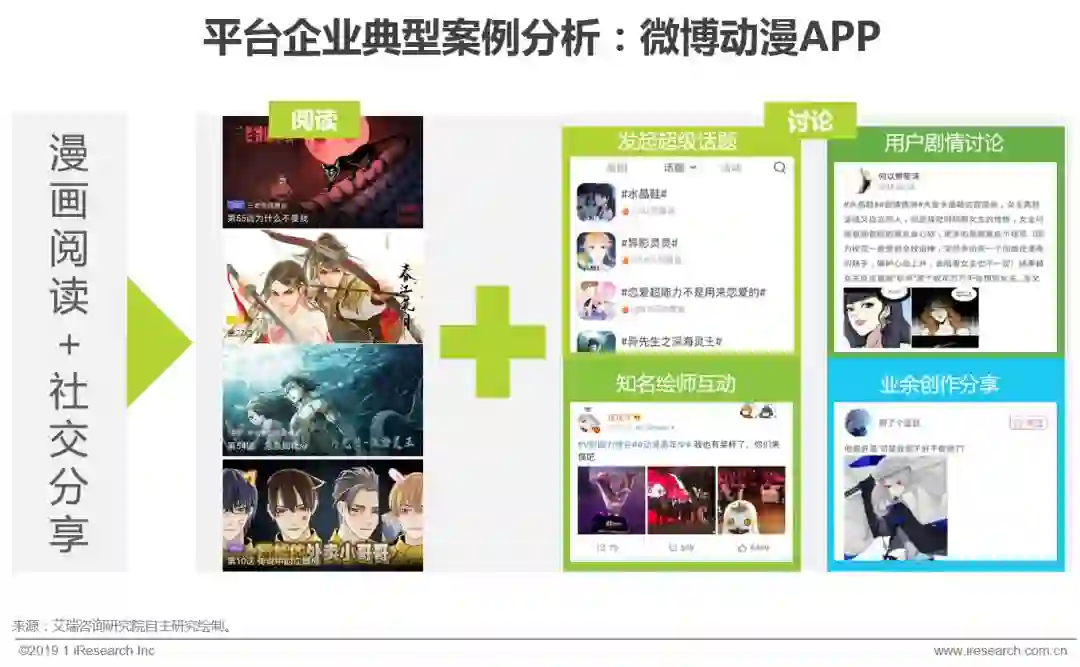 互联网具有极强的外部效应,那些拥有庞大用户数的互联网平台,也就越具有成为“装机必备”应用的潜力。对于漫画阅读平台而言,内容社交将使其具有成为一个集漫画阅读、社交、衍生品分发推广的一站式文化消费平台的可能。根据艾瑞调研显示,动漫用户最常进行的相关活动就是在网上社区讨论动漫剧情解析和进行动漫评价。一方面,用户有内容社交的需求,另一方面,漫画平台只有以内容为核心,衍生出内容社交的需求,才具备开展流量转化业务的可能。以微博动漫为例,微博的动漫领域是微博社交中最为活跃的垂直领域之一,围绕动漫作品的讨论不仅能与内容阅读业务相结合,而且能够依托微博账号搭建IP粉丝的交流沟通平台,在后续IP的内容衍生、广告合作、实物衍生给开发中扮演流量中转站的角色。