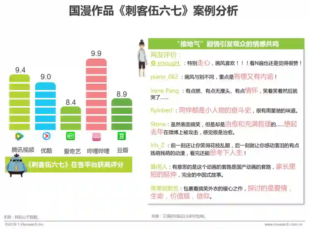 《刺客伍六七》是由啊哈娱乐(上海)有限公司与广州小疯文化传播有限公司联合出品的原创网络动画,于2018年4月开播,长期居于哔哩哔哩新番榜第一名,更是今年唯一一部入围有“动画奥斯卡”之称的法国昂西国际动画电影节主竞赛单元的国产动漫。《刺客五六七》的故事内容取材于生活,采用了喜剧的表达方式,讲述的却是现实中每个人都不可避免遇到的“爱与偏见”的严肃主题。《刺客伍六七》对国漫最大的启示是它的探索精神,它的形象风格既不日式也不美式,也非一般认知中的中国风,而是非常中国特色接地气,喜剧表演方式充分发挥了动画性,故事结构严谨。它成功借助这些独一无二的特质和元素,使得《刺客伍六七》创造了自己在国漫中全新定位,成为一个独特的案例。给当前处于相对冷却期的动漫行业带来了希望和启示。