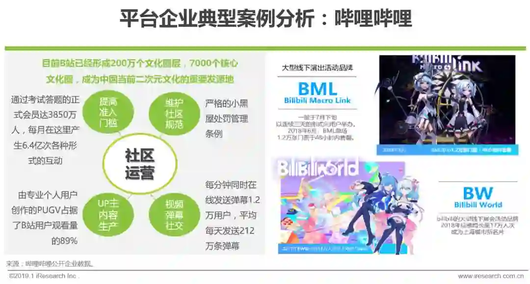 哔哩哔哩(Bilibili)最初是由 ACG(Animation、Comic、Game,动画、漫画、 御宅向游戏)启发的一个内容社区,拥有动画、番剧、国创、游戏等内容分区,是中国目前最为活跃的二次元社区之一,用户日均使用时长高达75分钟。B站的高粘性源于自身活跃的社区氛围的营造和维持。B站作为社区运营者和管理者,通过考试答题来筛选正式会员,提高社区的进入门槛;在提供弹幕社交服务、UP主UGC生产服务的同时,维护社区生态规范。通过在B站运营中形成的品牌影响力,哔哩哔哩将自主品牌延伸到了线下,打造了Bilibili Macro Link 和Bilibili World等极具号召力的动漫线下活动。