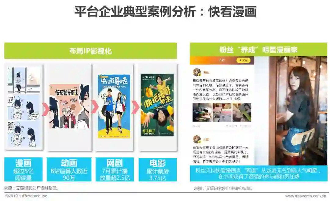 快看漫画是快看世界(北京)科技有限公司旗下手机端看漫画的移动应用,以条漫、高清、全彩等特点获取了大量年轻用户,自主运营孵化包括《复仇高中》系列、《整容游戏》等多部爆款。IP 影视化是快看漫画布局的重要方向,快看漫画独家作品《快把我哥带走》已经制作成动画、网剧和大电影等,并且都取得了不俗的成绩。快看漫画打造“偶像养成”的运营模式。漫画作者可以通过社区互动、拍摄平面硬照、参与微博访谈、线下签售等活动,表现偶像魅力,同时曝光漫画IP 衍生的配套周边内容,快速积累精准的受众粉丝,建立“偶像与粉丝”的关系。