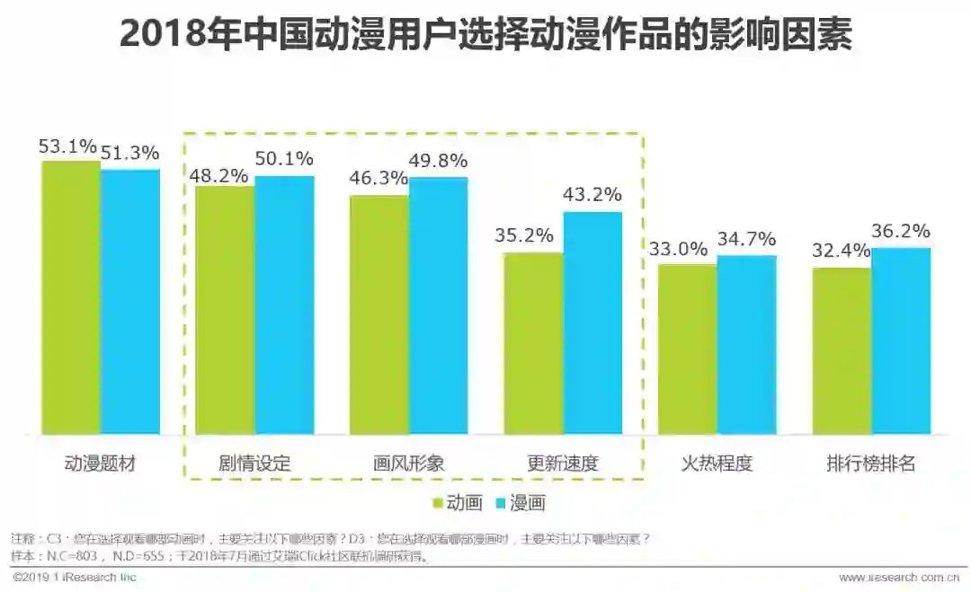 无论是动画用户还是漫画用户,在选择某部动漫时,最看重的都是动漫的题材类型,动漫题材的丰富性和多样性是满足动漫用户不同需求的重要保障。此外,漫画比动画要更看中“剧情设定”和“画风形象”这两大因素,主要由于漫画是静止的画面,情节递进需要更长的篇幅来演绎衔接,对人物形象的设计和动作的流畅感要求更强。而且,漫画需要漫画作者一话一话的绘制,创作耗时费力,更新速度较慢,因此更新速度也成为影响用户选择的重要因素。