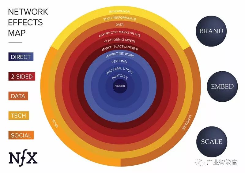 在数字时代,网络效应是仅剩的四大防御能力之一,其他三个分别是品牌、植入以及规模。在这四种能力当中,网络效应是目前为止防御性最强的一种。迄今为止,我们共发现了13种网络效应类型,可分为5个大类。