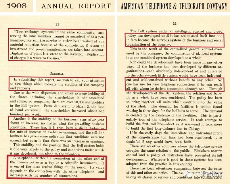 下面就是1908年那份年度报告的相关页面。你会注意到Vail没用过“网络效应”这个词,尽管概念是他描述的。网络效应这个词是后面才出现的。