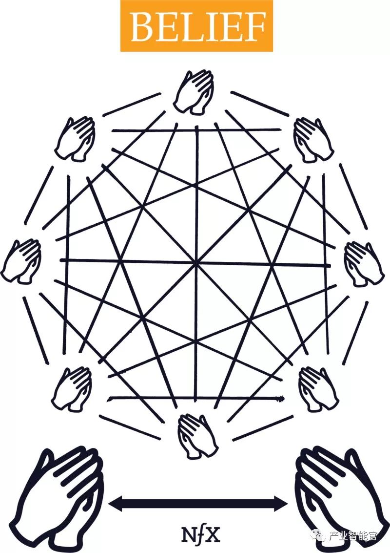 如上图所示,数字网络的每一个节点都与其他的每一个节点互连。每一个新加入网络的节点都会增加与所有已有节点的新连接,所以新增连接数(网络密度)相当于节点数的平方(N2)。由于网络的价值与其密度成正比关系,每一个新增节点都会让网络价值以几何速率增长。