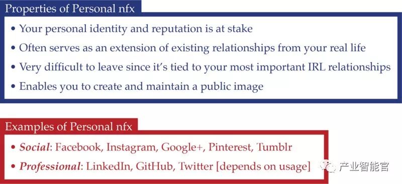 当个人身份或者名声跟产品绑定在一起时,就会产生个人网络效应。个人网络上的人往往容易受到自己在现实生活中认识的人影响。如果你在现实世界中认识的人都使用同一款产品管理自己的身份与名誉的话,如果你自己也加入这个网络你也会增值不少。