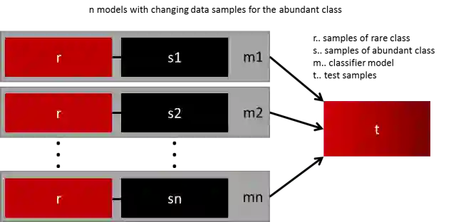生成通用模型的最简单方法是使用更多的数据。问题是,开箱即用的分类器,如逻辑回归或机森随林,倾向于通过丢弃稀有样例来推广。一个简单的最佳实现是建立n个模型,使用少数类的所有样本和数量充足类别的n个不同样本。假如您想要组合10个模型,需要少数类1000例,随机抽取10.000例多数类的样本。然后,只需将10000个样本分成10个块,训练出10个不同的模型。