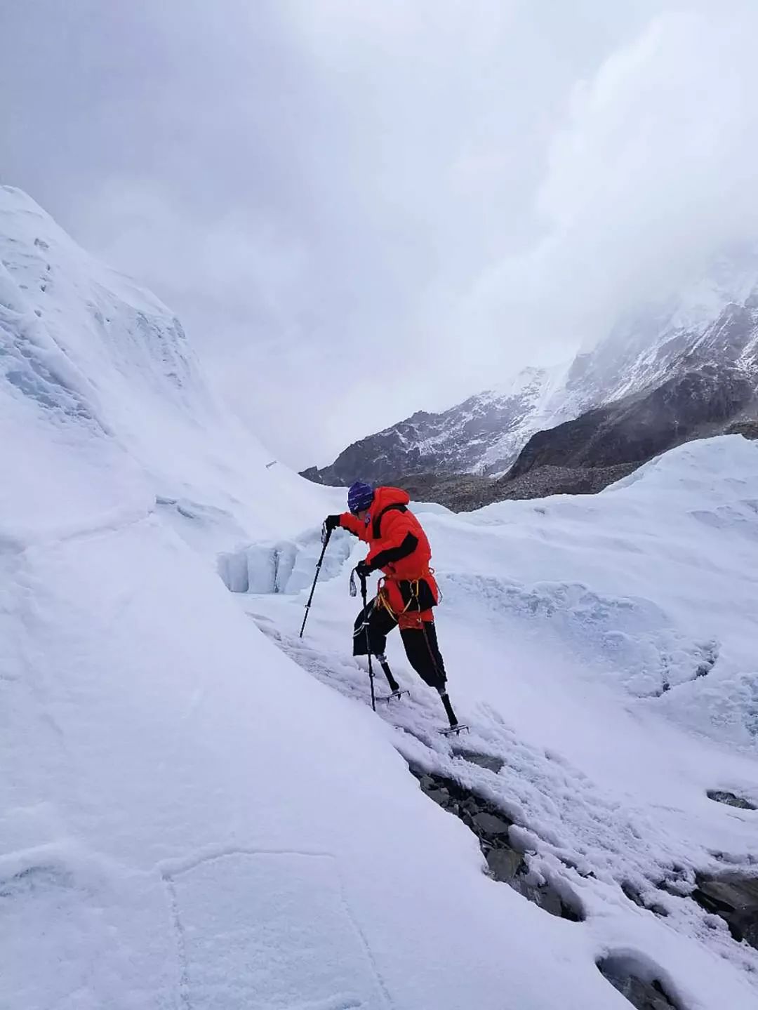 他不敢发力,怕一发力假肢会在冰缝里脱落。在这个海拔高度,那将是灭顶之灾,“万一掉下去我就全完了”。他立刻大声呼救,向导赶了过来,用工具把冰裂缝挖宽,然后抓住他的假肢,小心翼翼地将腿拔出来。这样的惊险,他遇见了两次。