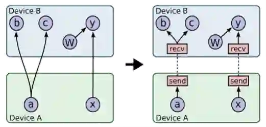 原生 TensorFlow 中异步训练中,使用的 Send/Recv Op 进行跨节点的 Tensor 传输,其中 Recv 节点对应一个 RPC 请求来传输一个 Tensor,即使有 Recv Ops 输出到相同的目标 Op。而且每个即使接收到的张量是标量,Recv 节点也会触发一个 RPC 操作。如图: