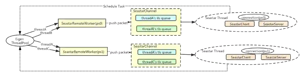 我们基于 Seastar 的设计特点,在通信收发链路的设计中延续了 Share-nothing 的设计,在完整的通信收发链路中整个流程通过 tls 实现了多线程的 share-nothing,并且基于 Message-Passing By Queue 的方式和外部的 TensorFlow 工作线程进行交互。