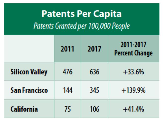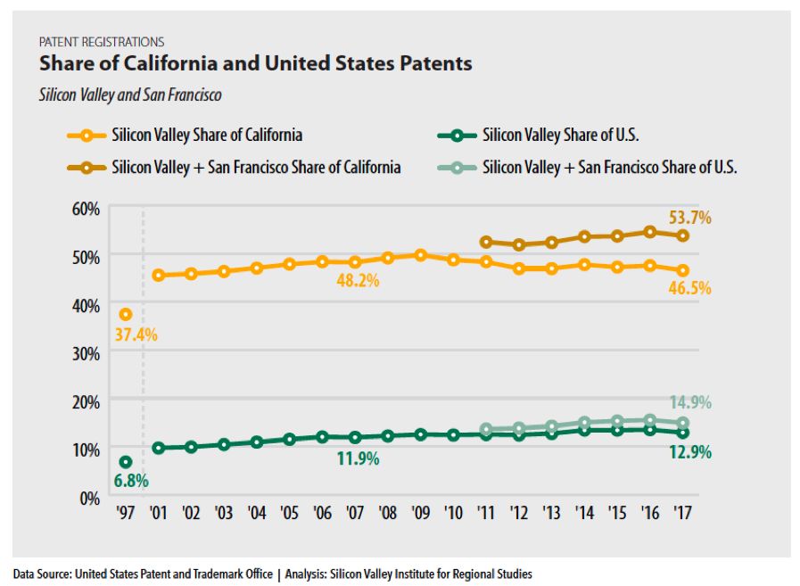 根据硅谷著名智库 Silicon Valley Joint Venture数据,2017年,硅谷(包含旧金山)的专利申请数占了全加州的53.7%, 全美的14.9%。此外,在过去的20年中,硅谷的人均专利注册数也呈大幅上升的趋势。