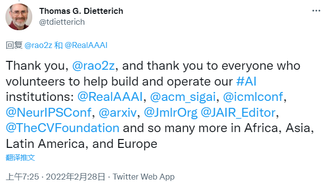 获奖者Dietterich本人很快回复了这条祝贺。他对 Subbarao Kambhampati表示感谢,也感谢了他曾任职的多个AI机构和组织中做出贡献的、来自世界各地的志愿者。