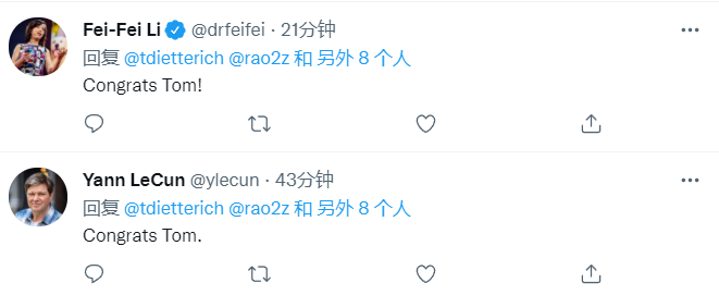 在这条推文下面,李飞飞、LeCun等业界大佬纷纷发推表示祝贺。