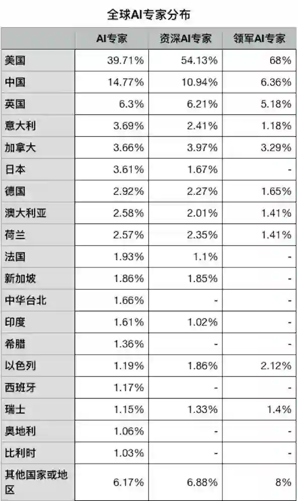 在全部AI专家中,华裔科学家占比26.69%,具有中国国籍的AI专家占比14.77%。