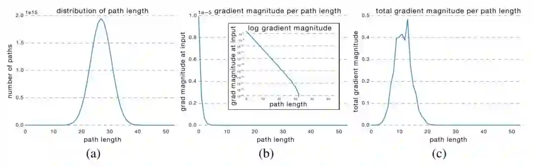 现在将每个路径长度的频率与其期望的梯度大小相乘,以了解每个长度的路径在训练中起到多大作用,如图 (c) 所示。令人惊讶的是,大多数贡献来自于长度为 9 到 18 的路径,但它们只占所有路径的一小部分,如 (a) 所示。这是一个非常有趣的发现,它表明 ResNet 并没有解决长路径的梯度消失问题,而是通过缩短有效路径的长度训练非常深层的 ResNet 网络。