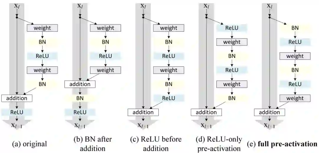 按照这种思路,[2] 的作者改进了残差块,并提出了一种残差块的预激活变体 [7],梯度可以在该模型中畅通无阻地通过快速连接到达之前的任意一层。事实上,使用 [2] 中的原始残差块训练一个 1202 层的 ResNet,其性能比 110 层的模型要差。