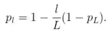作者将线性衰减规律应用于每一层的生存概率,他们表示,由于较早的层提取的低级特征会被后面的层使用,所以不应频繁丢弃较早的层。这样,规则就变成: