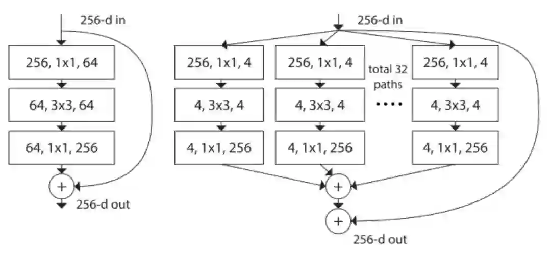 左:[2] 中 ResNet 的构建块;右:ResNeXt 的构建块,基数=32