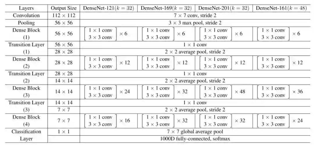 遵循该范式,我们知道第 l 层将具有 k *(l-1)+ k_0 个输入特征映射,其中 k_0 是输入图像的通道数目。作者使用一个叫作「增长率」的超参数 (k) 防止网络过宽,他们还用了一个 1*1 的卷积瓶颈层,在昂贵的 3*3 卷积前减少特征映射的数量。整体架构如下表所示: