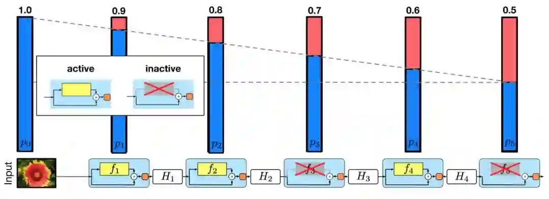 尽管 ResNet 的强大性能在很多应用中已经得到了证实,但它存在一个显著缺点:深层网络通常需要进行数周的训练时间。因此,把它应用在实际场景的成本非常高。为了解决这个问题,G. Huang 等作者在论文 [10] 中引入了一种反直觉的方法,即在训练过程中随机丢弃一些层,测试中使用完整的网络。