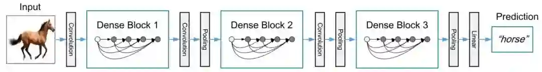 Huang 等人在论文 [9] 中提出一种新架构 DenseNet,进一步利用快捷连接,将所有层直接连接在一起。在这种新型架构中,每层的输入由所有之前层的特征映射组成,其输出将传输给每个后续层。这些特征映射通过深度级联聚合。