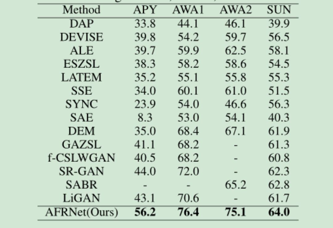 在表3中,AFRNet表示采用了基于残差的对抗视觉特征生成方法,AFRNet-non表示采用的是直接的对抗视觉特征生成方法。通过表3我们可以看出,基于残差的对抗视觉特征生成方法可以明显改进零样本学习的性能。