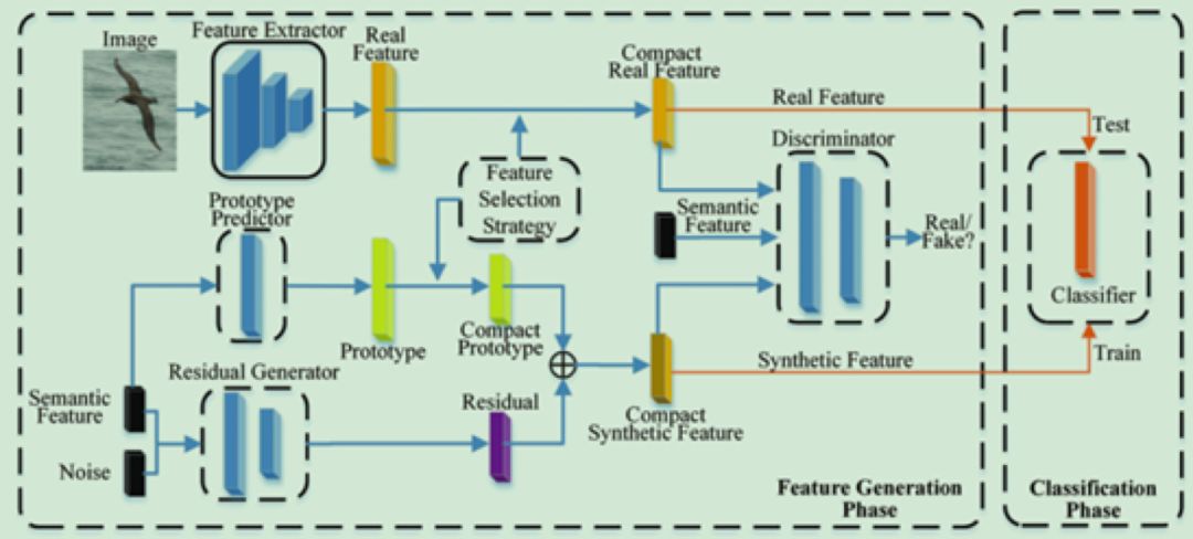 在特征生成阶段,条件生成器以语义特征为条件来生成视觉特征残差,原型预测器以语义特征为输入来预测视觉原型,将视觉残差和视觉原型结合,就可以合成视觉特征。将合成的视觉特征与特征提取器提取的真实视觉特征输入特征判别器进行对抗训练,最终得到一个可以生成视觉特征残差的条件生成器。
