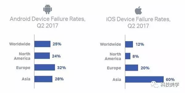 报告中提到,2017年第二季度全球Android手机的故障率为25%,iPhone手机的故障率为12%。不过这一数据在不同地区也有所差异。北美地区Android手机的故障率为24%,iPhone手机的故障率为8%,而亚洲地区Android手机的故障率为28%,iPhone手机的故障率为60%。