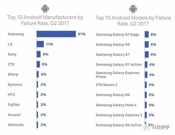 从品牌上来看,三星是2017年第二季度故障率最高的手机。并且在所有出现故障的手机当中,61%都是三星手机,其次是LG的11%。另外,故障率排名前5的都是三星手机,故障率排名前10的手机中,三星占据了9席……