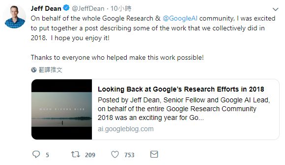 1月15日,谷歌高级研究员、谷歌AI负责人Jeff Dean发表了博文,回顾总结了2018年谷歌的技术研究进展。