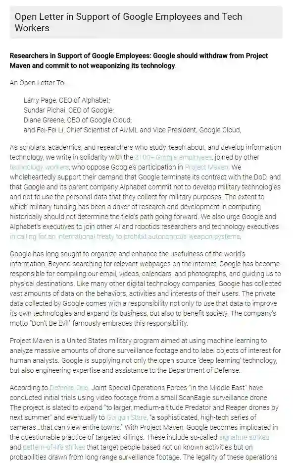 2018 年 4 月初,大约有 3100 多名 Google 员工签名,面向 Google CEO Sundar Pichai 提交了一封信,要求 Sundar 立即取消参与 Project Maven,并要求 Google 起草并公开一份清晰的政策表明:Google 和它的合作方不会开发用于战争的技术。
