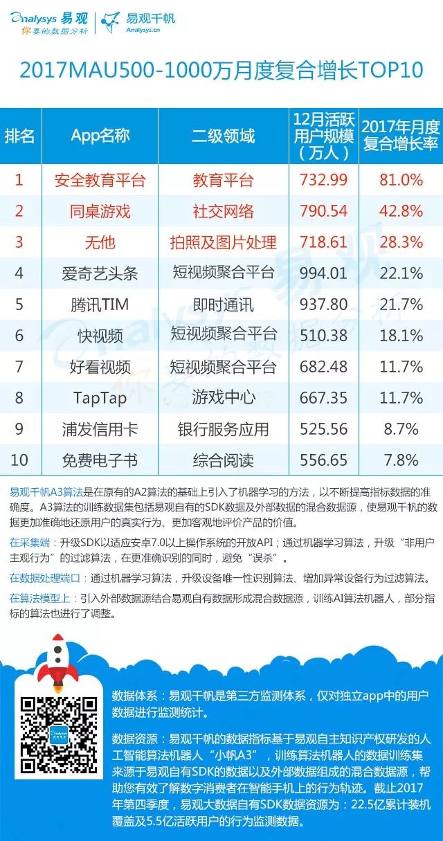 在MAU为500万到1000万的TOP10榜单中,我们可以看到安全教育平台以81%的月度复合增长率位居第一,社交和视频领域各占三席,拥有广泛受众的泛娱乐应用增长依旧可期。此外,摄影、金融和移动阅读在前十榜单中也各占一席之地。