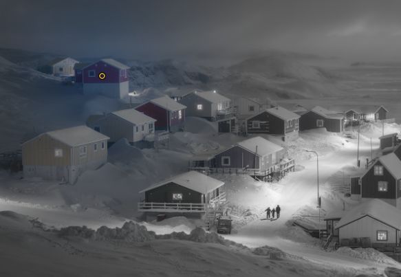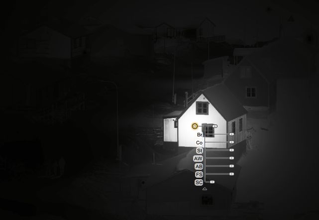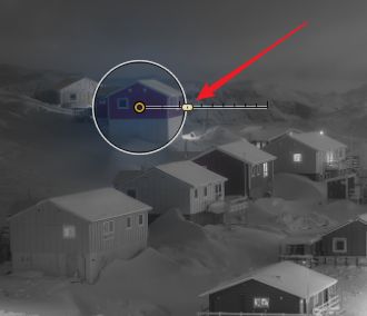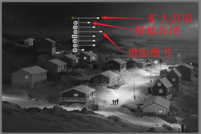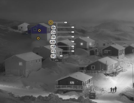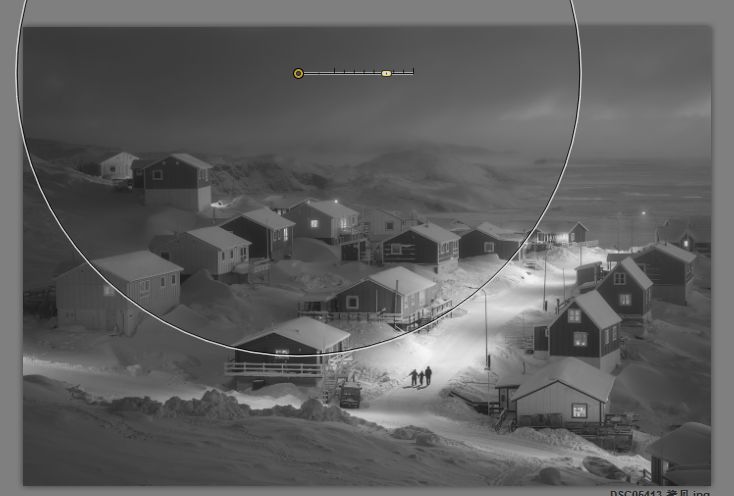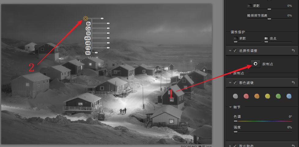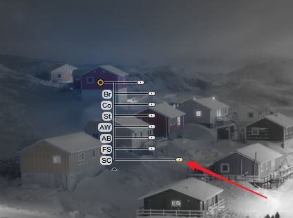 比如我把控制点放在紫色小房子上,右移“SC”滑块,只有紫色小房子周围恢复了彩色。当然现在这个控制点还不够精确,旁边的房子和雪地也恢复了彩色。