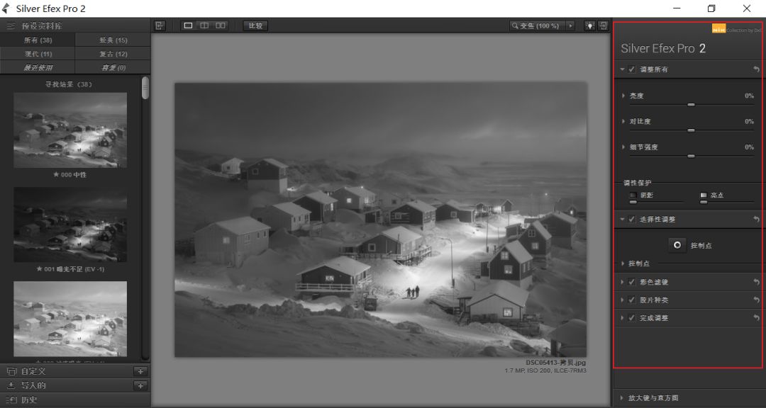 Nik Silver Efex分为左边的预设面板,中间的预览面板,和右侧的参数面板。今天我会详细讲解,参数面板中的“调整所有”和“选择性调整”,这两个黑白影调调整的核心工具。
