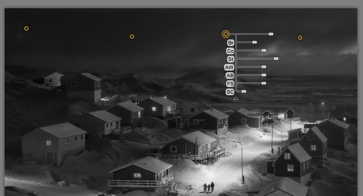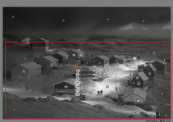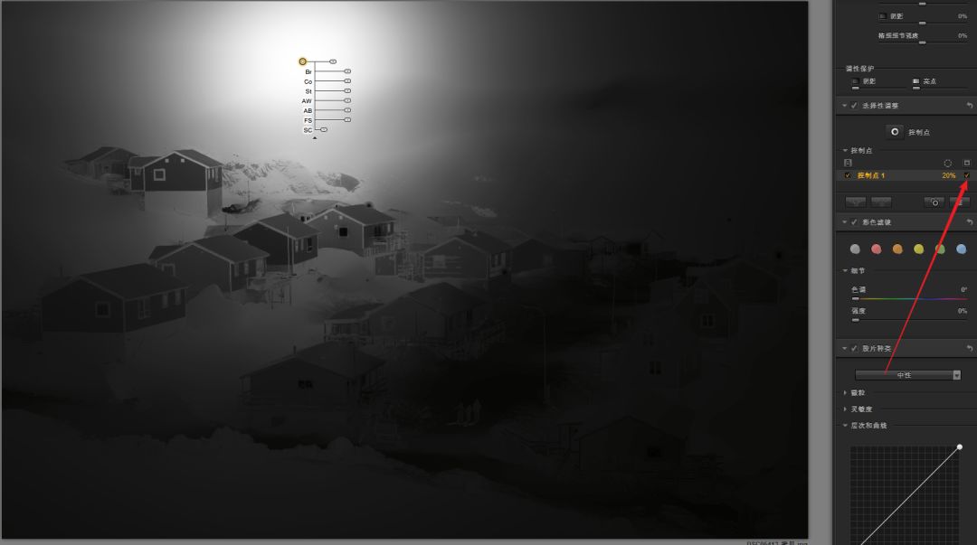 如果我只想对画面中的某一个局部、某一个物体,比如一个山、房屋、云进行单独调整,就需要利用”选择性调整“中的”控制点“了。