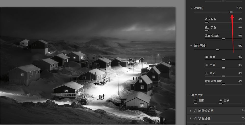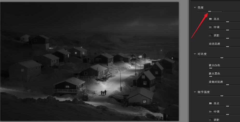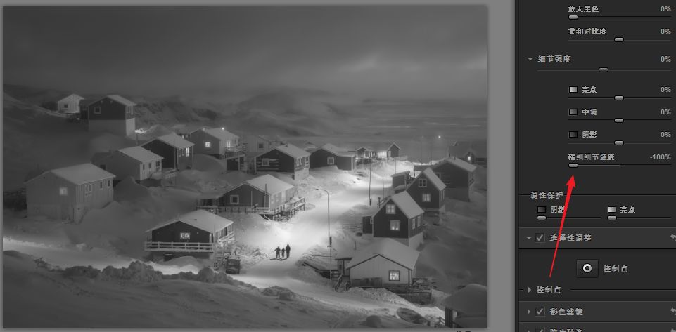 右移”精细细节强度“滑块,可以看到画面中大的边缘并没有被强化。但小的细节,如雪地上的坑坑洼洼纹理,却被增强了。