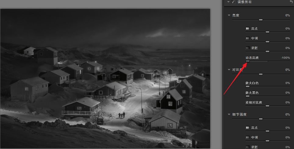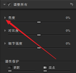 展开“调整所有”板块,可以看到“亮度”、“对比度”、“细节强度”等几个参数滑块。