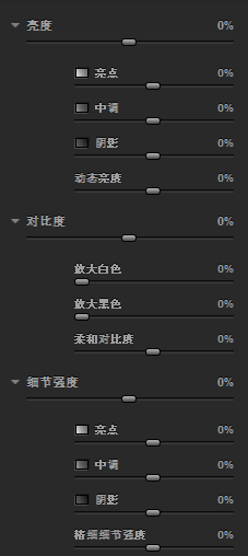 ”细节强度“的下面,也有”亮点“、”中调“和”阴影“三个分滑块,这样我们可以精确的控制画面亮部、中间调和暗部各自的细节清晰程度。