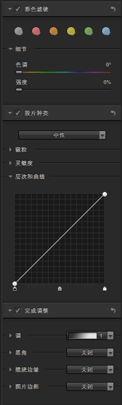 参数界面下面的“彩色滤镜”、“胶片种类”、“完成调整”板块,我会在未来的教程中详细讲解。