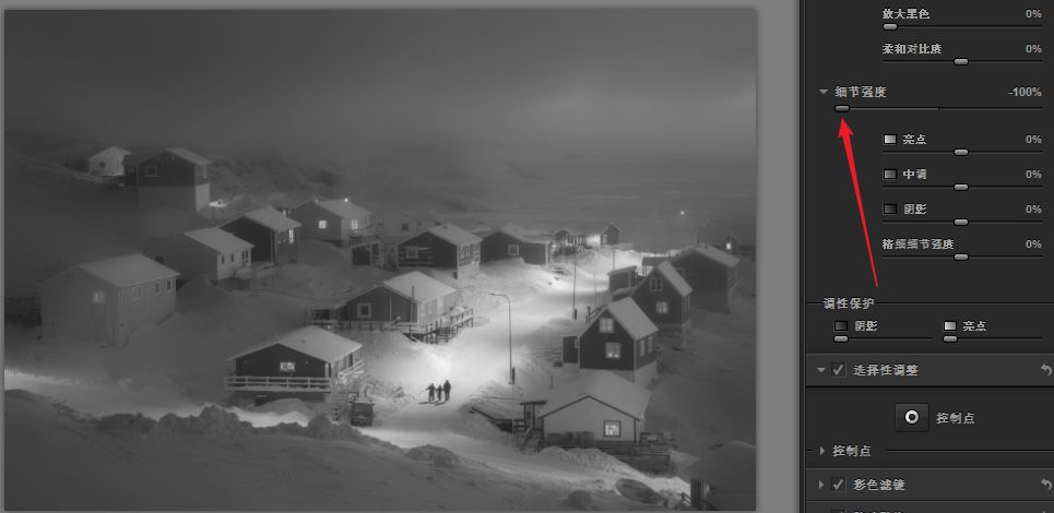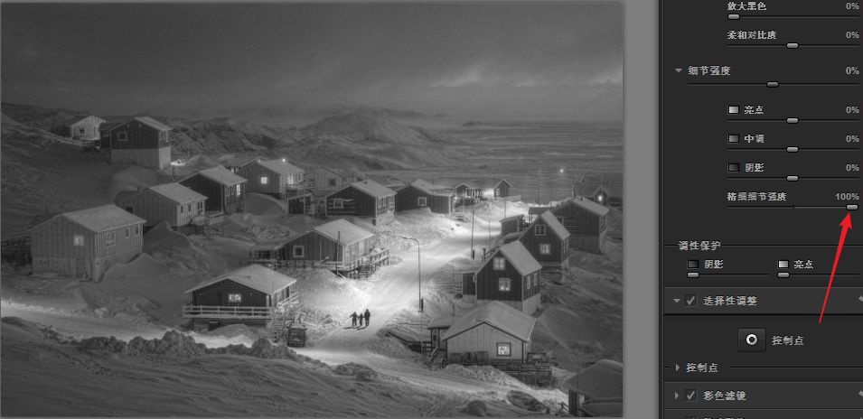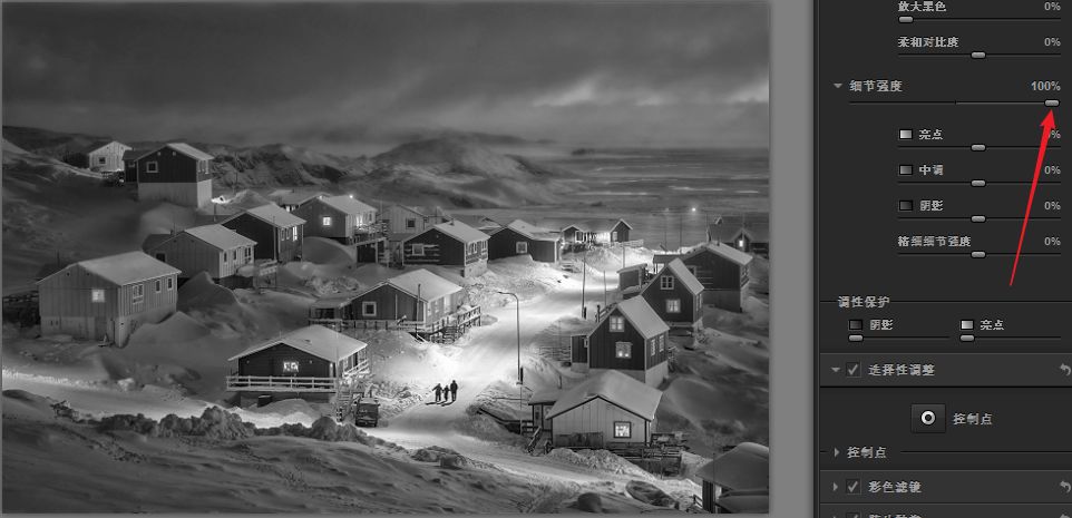 接下来就是”细节强度“滑块了,这个滑块和Camera Raw中的”清晰度“类似,右移”细节强度“,可以让画面中的细节更清晰。