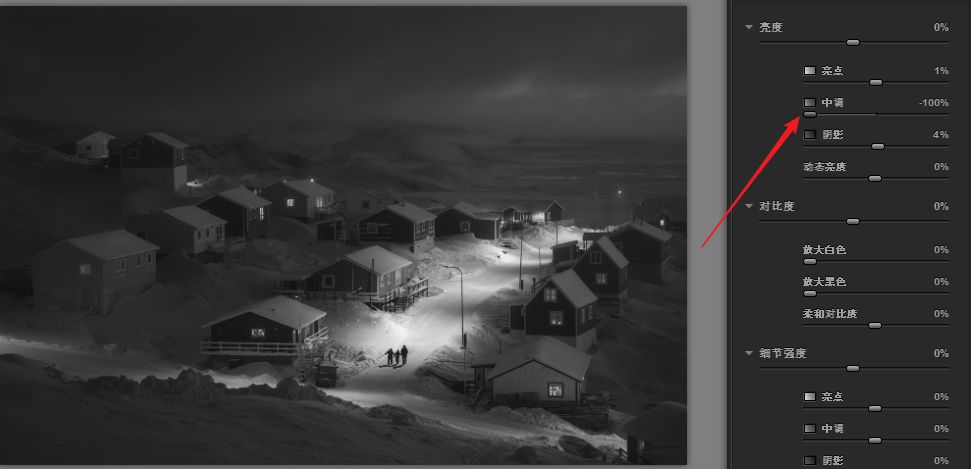 同时我还右移了”中调“滑块,增加画面中间调的清晰度,和刚刚对暗部的操作形成了对冲。