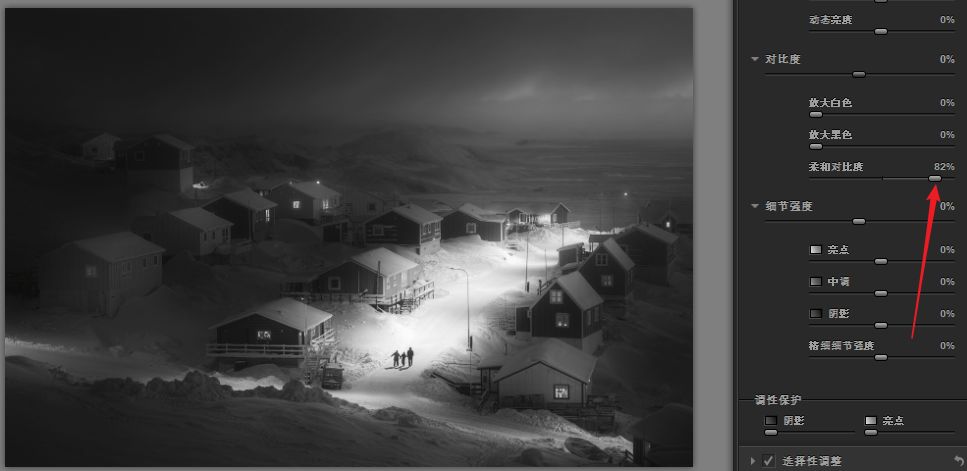 比如右移”柔和对比度“滑块,画面在亮部变亮,暗部变暗的同时,还进行了一定程度的柔化。