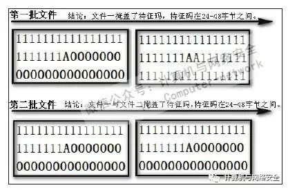 由图33可知,文件被填充到一半时正好会破坏掉了特征码,此后无论怎样被填充都不会将特征码暴露出来了,所以MyCCL得出了“文件一与文件二掩盖了特征码,特征码在24~48字节之间”这个结论,也就是将半个文件都定位成特征码了。而当用这个结论来进行二次“复合定位特征码”时,却永远也找不到带毒文件,因为这处特征码在定位时已经被一分为二了。所以说此时用MyCCL定位的最高精度就是这一半文件的大小了。